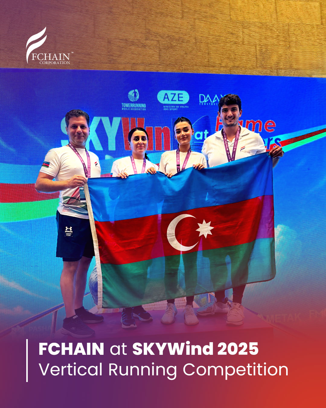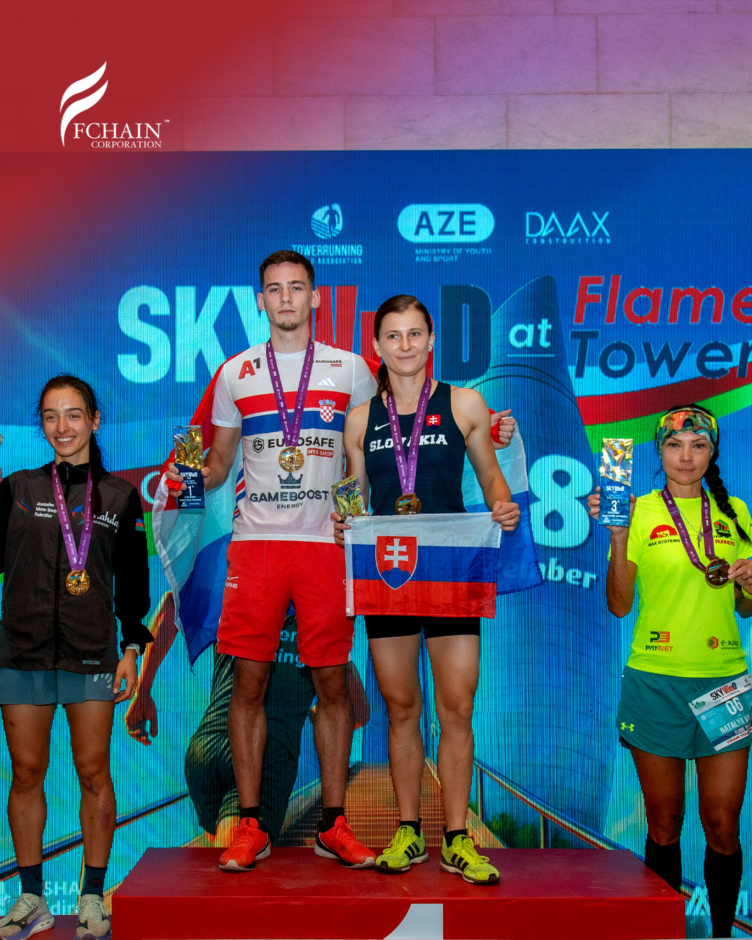 The race required participants to run up to the 32nd final floor of the Flame Towers, covering a vertical height of 160 meters. Alongside local and international professional athletes in the PRO category from Spain, Slovakia, Romania and Croatia, the FCHAIN team also took part in this exciting competition, completed the distance and earned a participant medal.